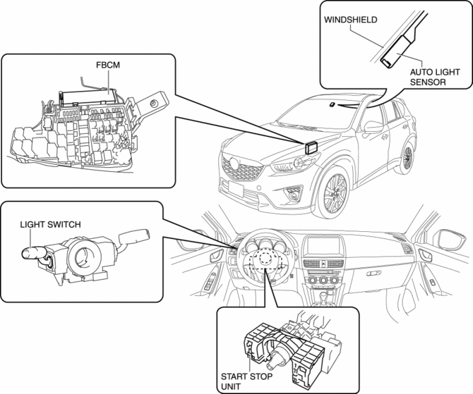 1. When the light switch is operated to the AUTO position with the ignition switched ON (engine off or on), a light switch AUTO signal is input to the start stop unit.
