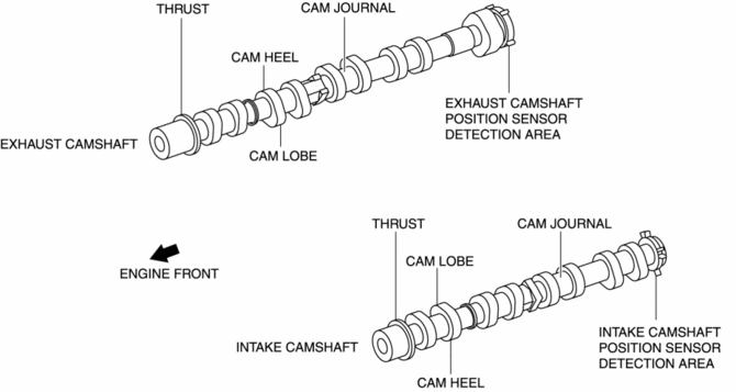 The intake camshaft is a five-bearing type and the exhaust camshaft is a six-bearing type.