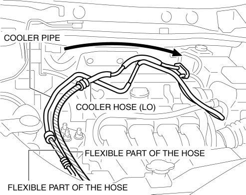 When setting the cooler hose (LO) and cooler pipe aside, only bend the flexible part of the hose. If force is applied to areas other than the flexible hose, the pipe will bend and could be damaged.