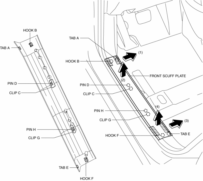 2. Take the shaded area shown in the figure, detach tab E while pulling the front scuff plate in the direction of the arrow (3) shown in the figure, then detach the hook F, clip G and pin H while pulling in the direction of the arrow (4).