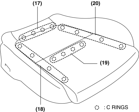 16. Remove the C rings in the order of (17), (18), (19), and (20) shown in the figure, and remove the front seat back trim from the front seat back pad. (without power seat system for driver-side)