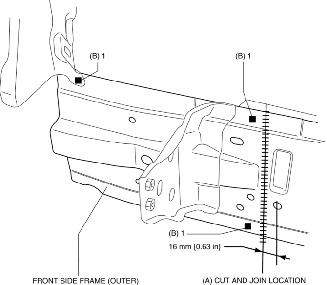 7. Plug weld the 4 locations indicated by (B) shown in the figure, then install the reinforcement to the new front side frame (inner).