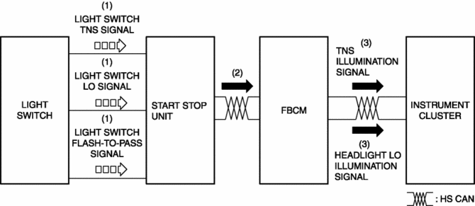 1. When the light switch is operated to the TNS, HEAD, or parking position, a light switch TNS, LO, or parking signal is sent to the start stop unit.