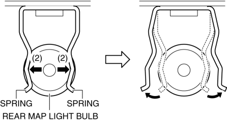 7. Move the rear map light spring in the direction of the arrow (2) shown in the figure and detach the rear map light spring and rear map light bulb.