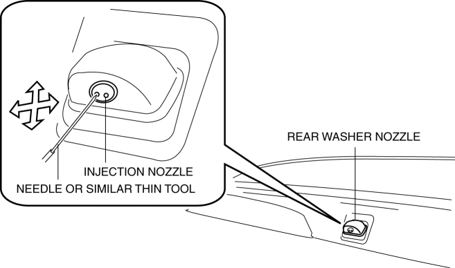 1. Insert a needle or similar thin tool into the injection nozzle of the rear washer nozzle and adjust the area where washer fluid injected from the rear washer nozzle is sprayed as shown in the figure.