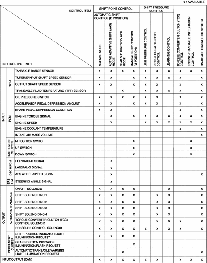 • Main part of transaxle control includes self-diagnosis function. In case of malfunction, automatic transmission warning light illuminates to alert driver, and DTC is stored in TCM