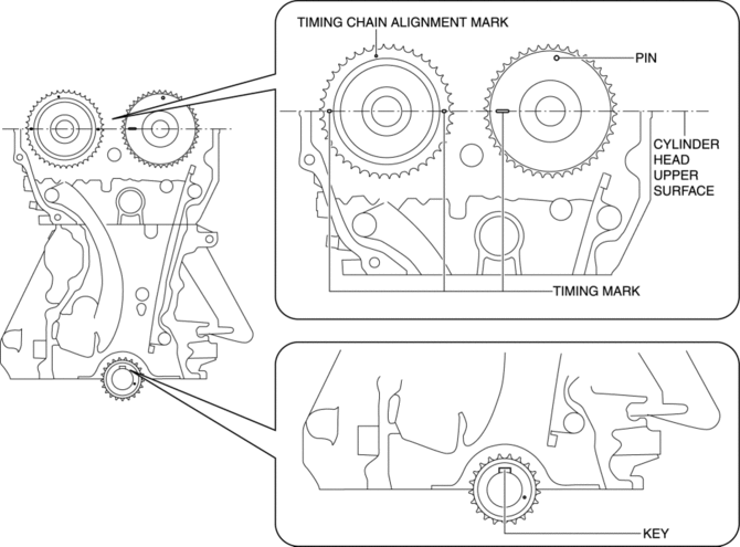 2. Install the timing chain while aligning the marks on each sprocket and the timing chain as shown in the figure.