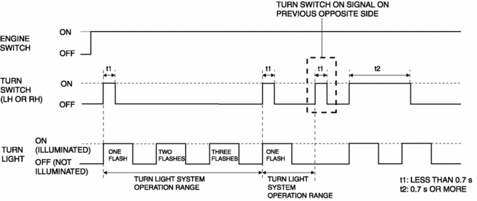If the front body control module (FBCM) receives the turn switch on signal from the previous opposite side during the turn light system operation, it stop the turn light system operation. In addition, if the turn switch on signal on the opposite side is less than 0.7 s, the turn light system does not operate.